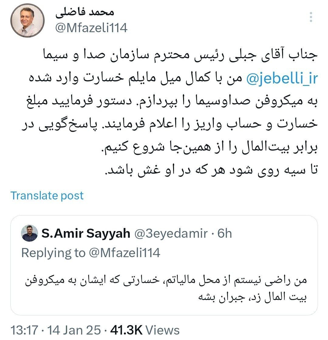 جناب آقای جبلی رئیس محترم سازمان صدا وسیما من با کمال میل مایلم خسارت وارد شده به میکروفن صدا وسیما را بپردازم. دستور فرمایید مبلغ خسارت و حساب واریز را اعلام فرمایند.
