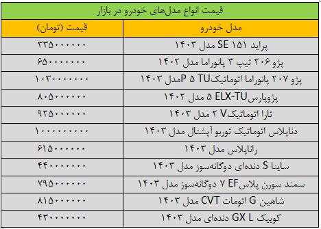 در این میان، قیمت پژو ۲۰۶ تیپ ۳ پانوراما مدل ۱۴۰۲ بدون تغییر، ۶۵۰ میلیون تومان قیمت خورده است. پژو ۲۰۷ دندهای مدل ۱۴۰۳ اما ۷۶۵ میلیون تومان به فروش رفت. این در حالی است که پژو ۲۰۷ پانوراما اتوماتیک TU۵P مدل ۱۴۰۳ در حدود یک میلیارد و ۳۰ میلیون تومان به فروش رفت. پژو ۲۰۷ تیپ ۵ مدل ۱۴۰۲ نیز ۶۷۰ میلیون تومان قیمت پیدا کرد. اما پژوپارس ELX-TU۵ مدل ۱۴۰۲ با کاهش ۵ میلیون تومانی به قیمت ۸۰۵ میلیون تومان رسید. پژوپارس LX مدل ۱۴۰۲ هم با کاهش ۱۰ میلیون تومانی، ۸۳۵ میلیون تومان قیمت پیدا کرد.